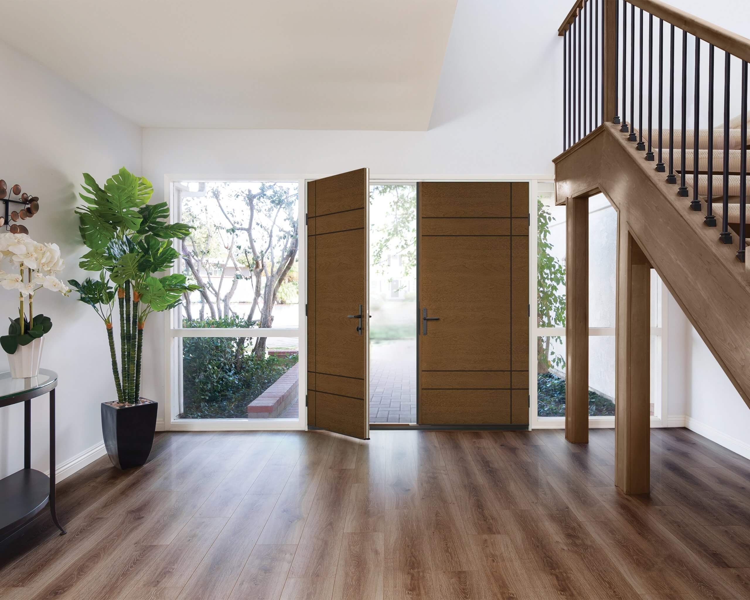 Les portes pleines avec vitrage latéral ou imposte vitrée gagnent en popularité, ainsi que le vitrage triple à faible émissivité (Low-E), des solutions qui fournissent la lumière naturelle recherchée tout en permettant de répondre aux normes d’efficacité énergétique.