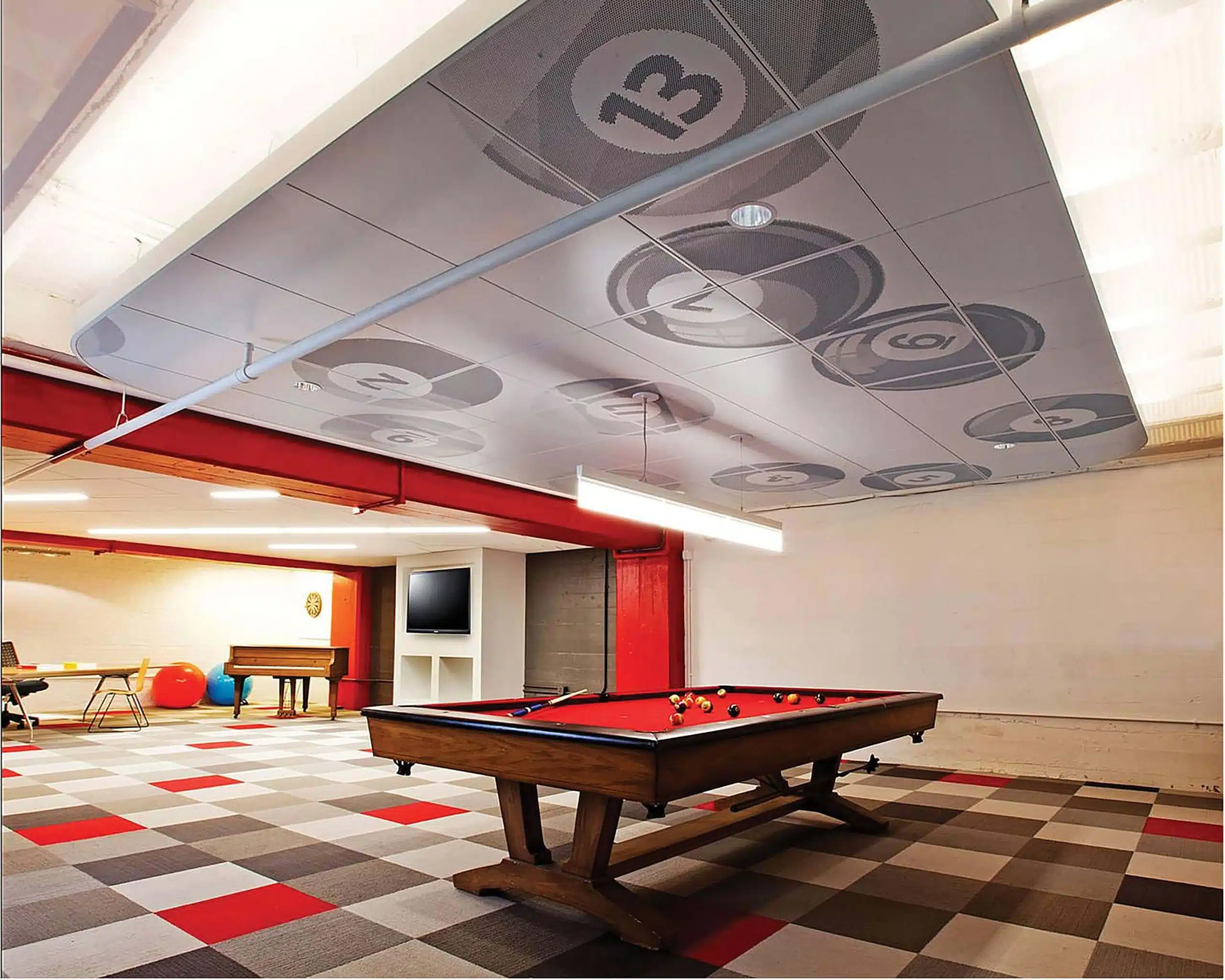 Floating panels also bridge the best of two worlds: Designers maintain an edgy, industrial feel, since duct work and high ceilings are still visible, but the “clouds” offer the acoustical benefits of a panelled ceiling.
