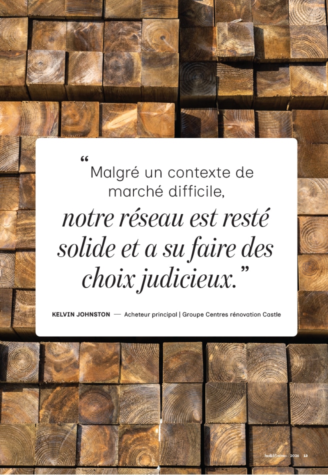 Malgré l’instabilité, les menaces tarifaires et les revirements politiques, les détaillants Castle ont réussi à garder le cap, explique Kelvin Johnston, acheteur principal pour le Groupe Centres de rénovation Castle et responsable du bois d’œuvre et des panneaux. « Nos détaillants ont connu une bonne année, dit-il, mais c’était malgré les conditions, et non parce qu’elles étaient favorables. »