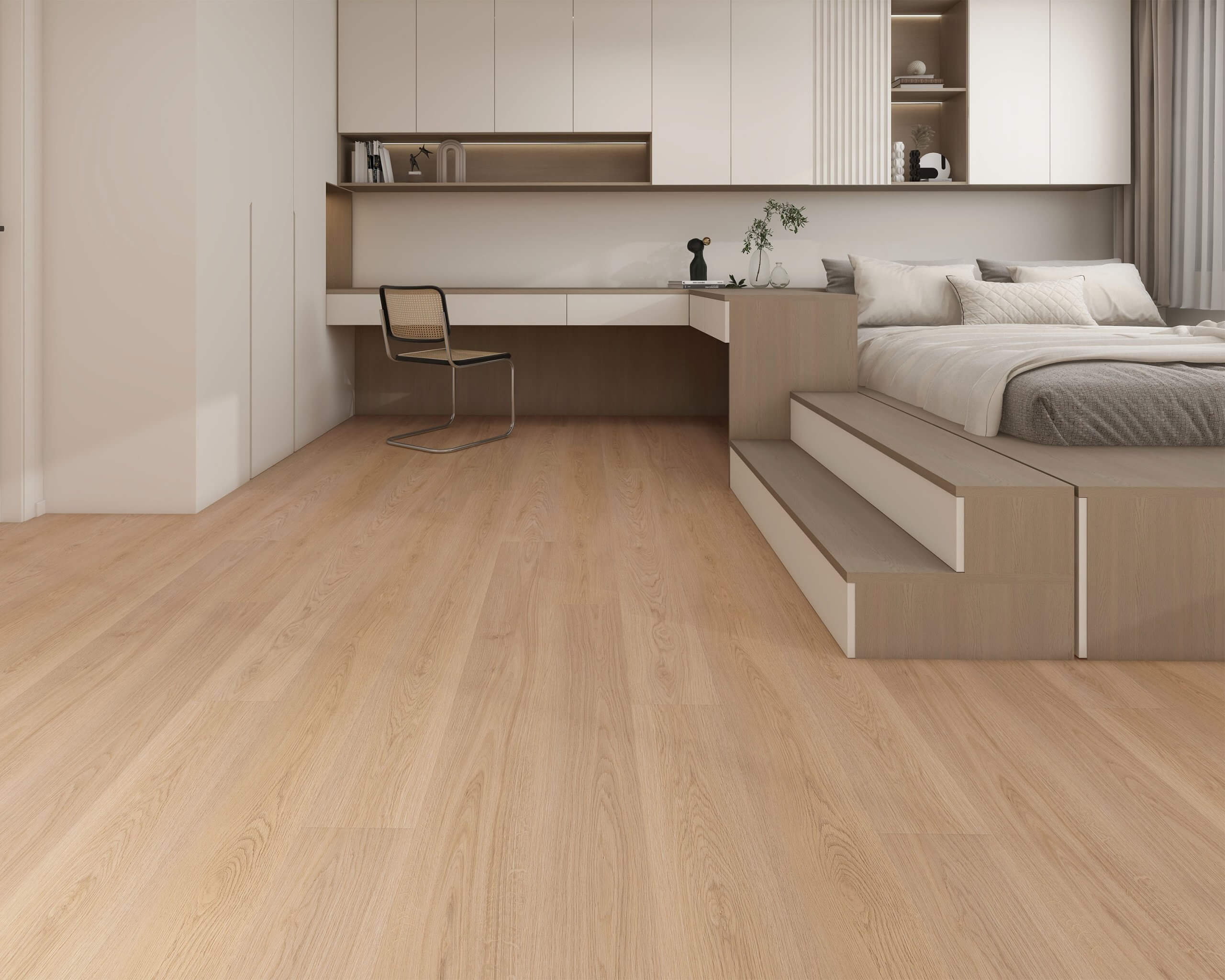In this case, his design advice differs from an open-concept SPC, vinyl or laminate-covered home. “Unlike doing a whole floor level with SPC, homeowners are turning to wood often because they have existing hardwood that they don’t want to change but want to add to it.” —