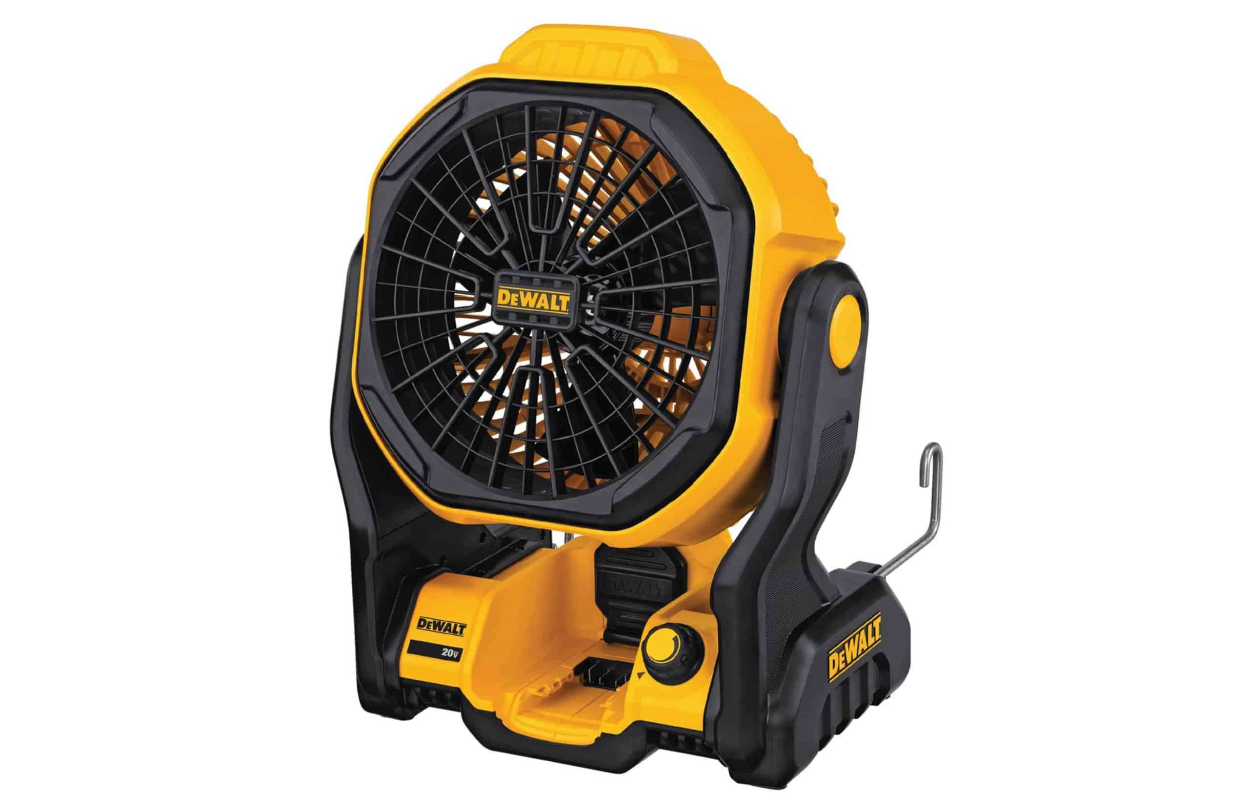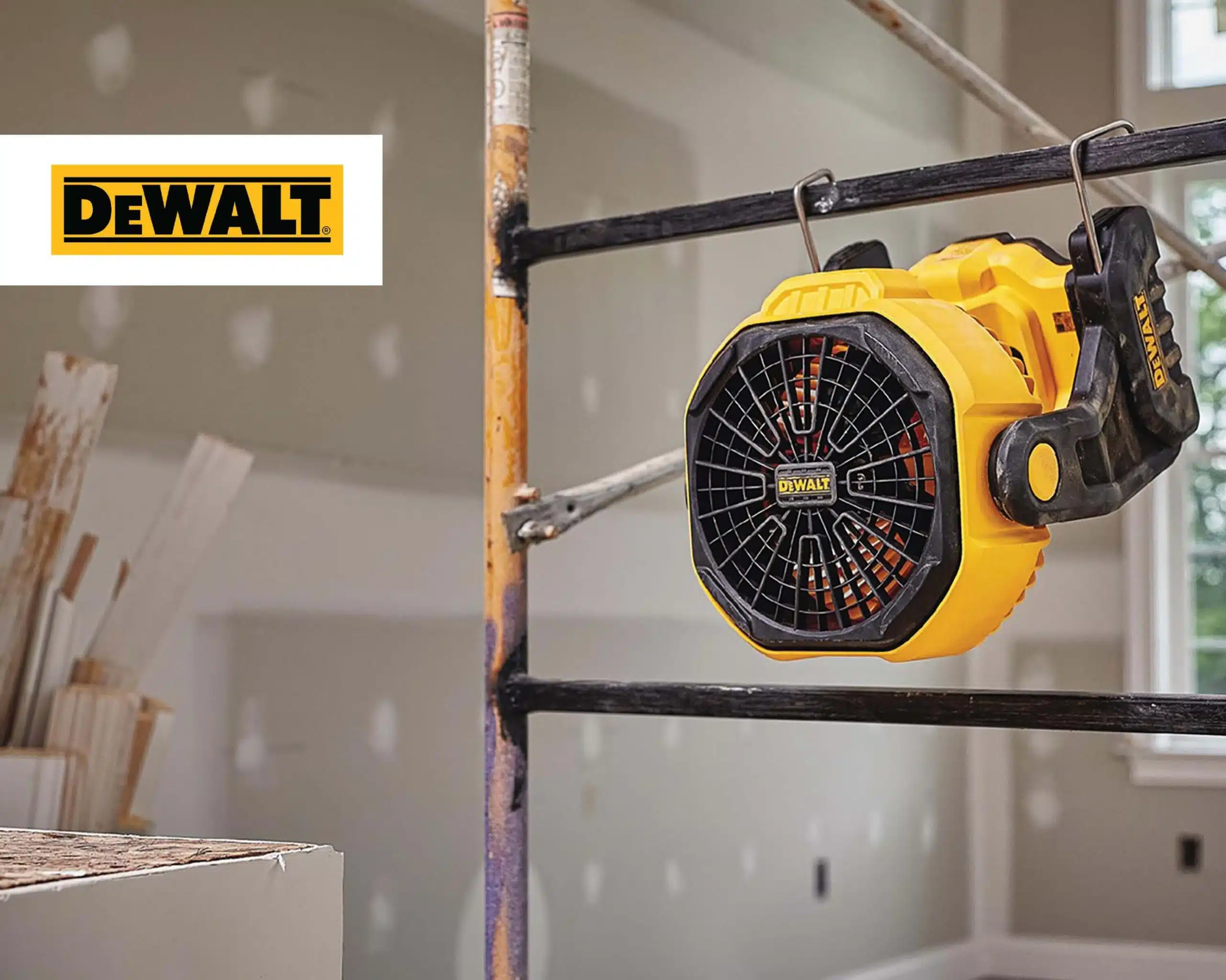 The 20V MAX* Jobsite Fan delivers up to 500 CFM at maximum speed**. There are several convenient options for mounting the 20V MAX* Jobsite Fan. Depending on the jobsite, the fan can be hung from adjustable steel hanging hooks, or mounted by screw or tripod to fit the user’s needs. With a pivoting head and variable speed switch, users can easily adjust the fan to best suit their work area.