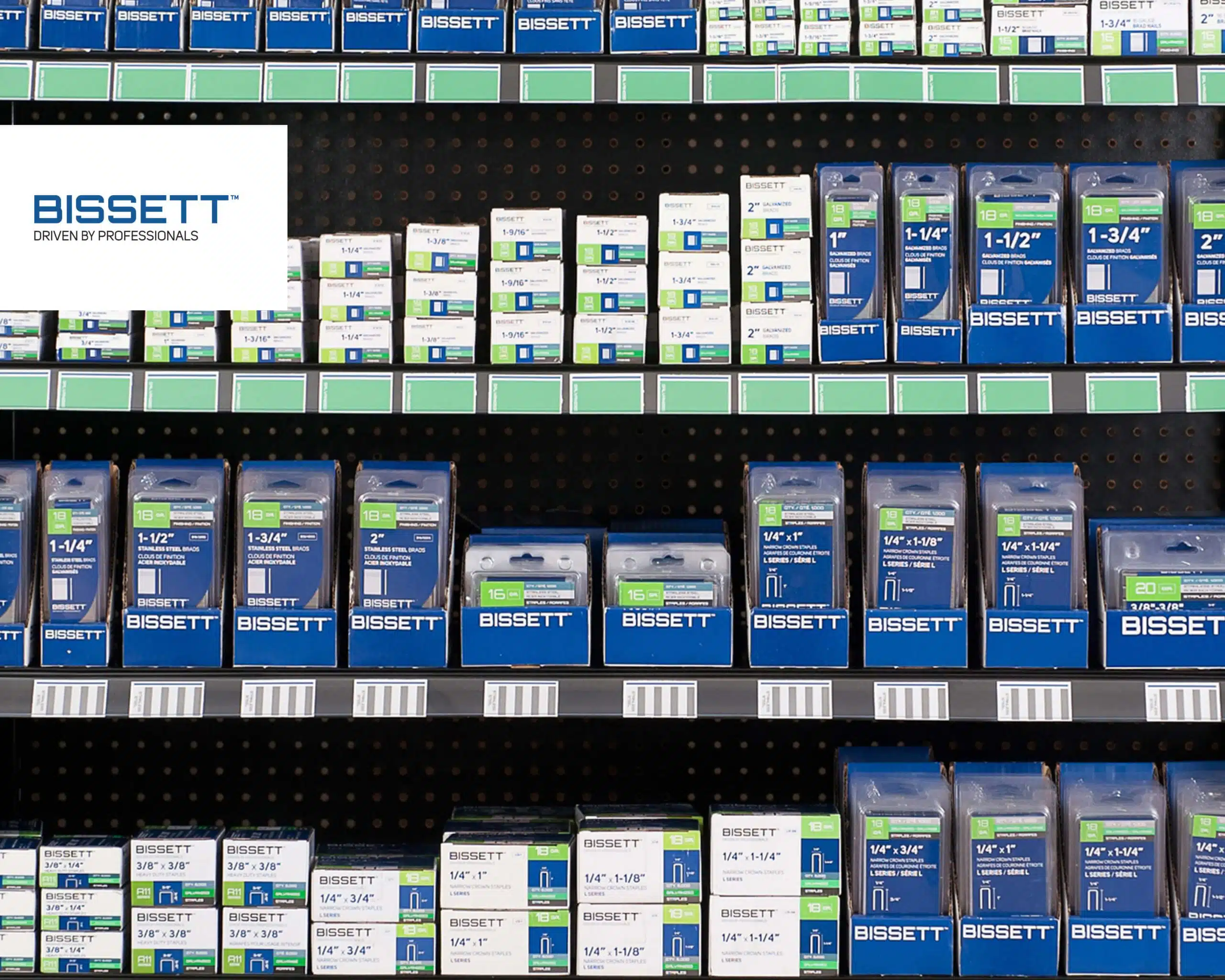 The Bissett product offering is represented by a dynamic merchandising program that includes nearly 500 branded SKUs. Always seeking to innovate the platform, the company offers customers a web/app called the “Bissett Fastener Finder” where users can quickly and easily find which fasteners are compatible with their tool. All Bissett Fasteners are directly compatible with a wide range of market leading pneumatic tool brands such as Bostitch, Hitachi, Max, Paslode, Senco, and more. Bissett Fasteners is a trusted Canadian brand with the most rigorous quality control program in the industry, thus reducing reliability concerns and making job site performance issues a thing of the past!